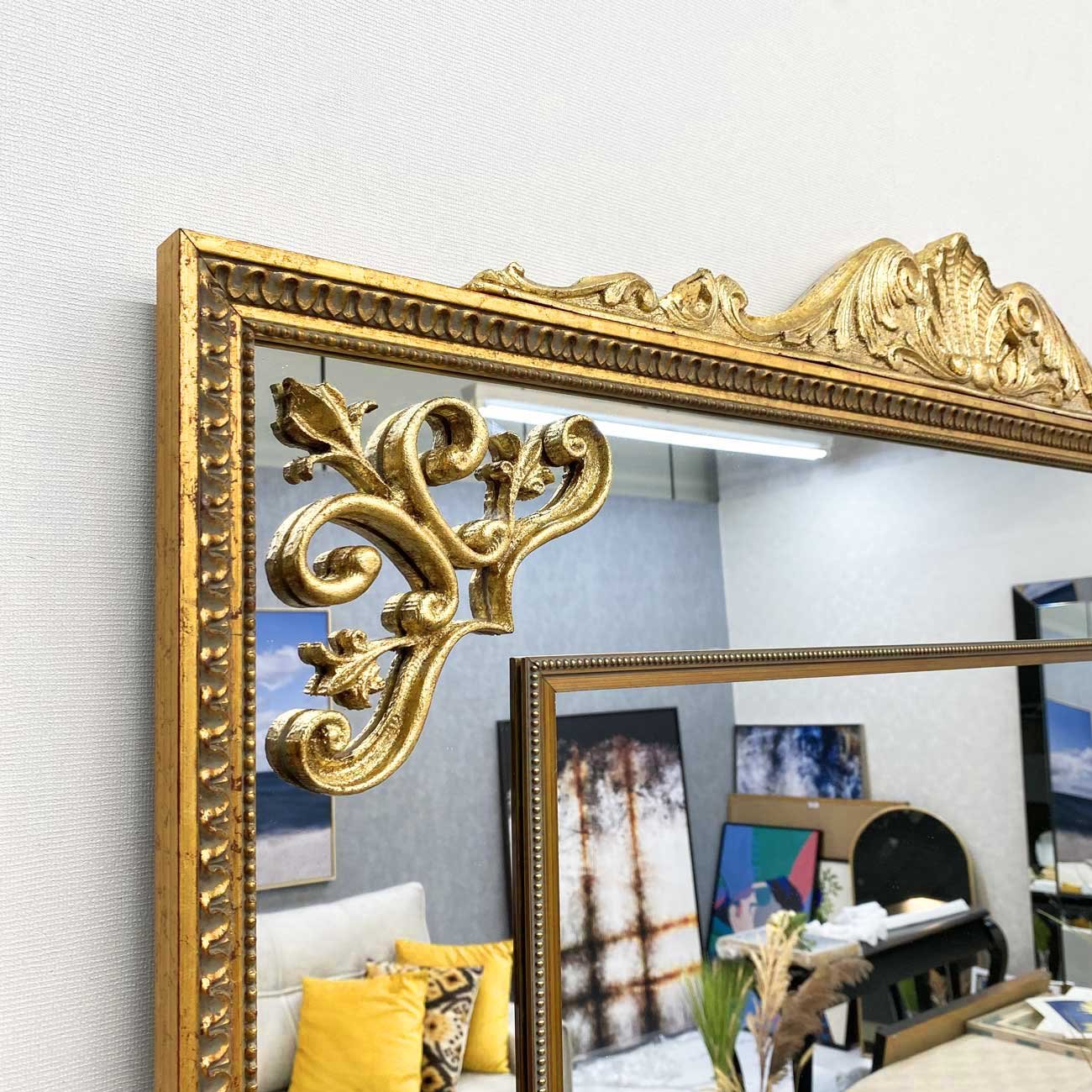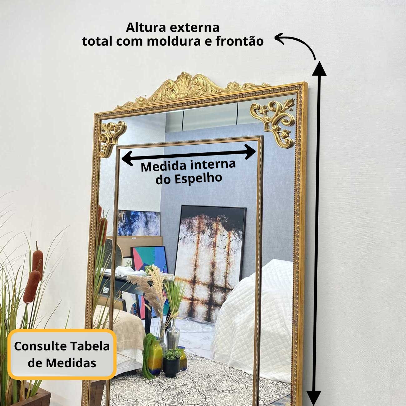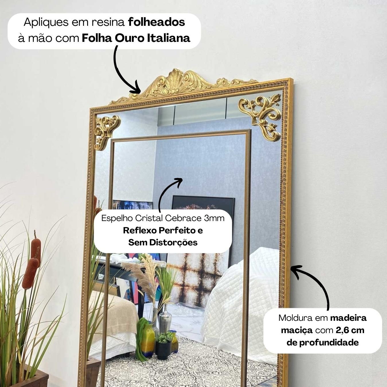 A moldura dourada, além de conferir um toque de luxo ao espelho, é produzida em madeira de alta qualidade, o que garante a durabilidade do produto. Os apliques folheados em folha de ouro são feitos em resina, garantindo a beleza e a delicadeza dos detalhes.