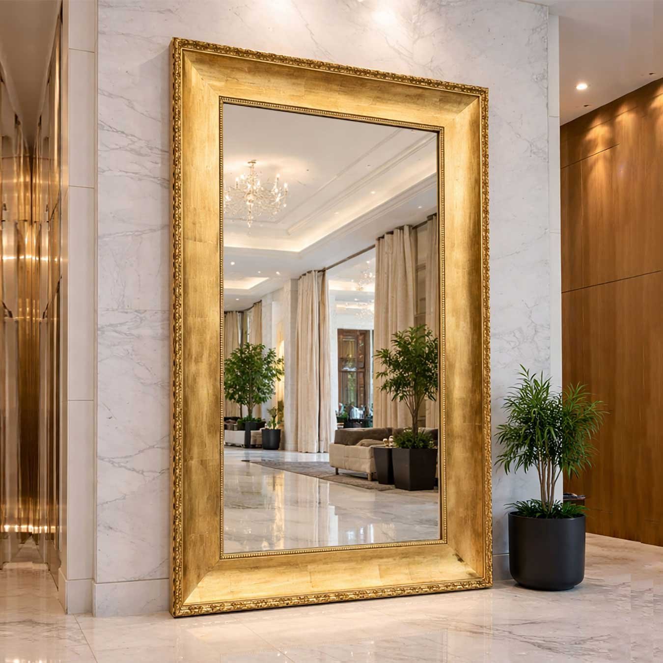 Além do impacto visual, o espelho entrega uma experiência sensorial: o brilho sutil do dourado, a profundidade da moldura e o reflexo cristalino criam uma atmosfera acolhedora e ao mesmo tempo imponente — característica essencial para projetos que buscam transmitir exclusividade.