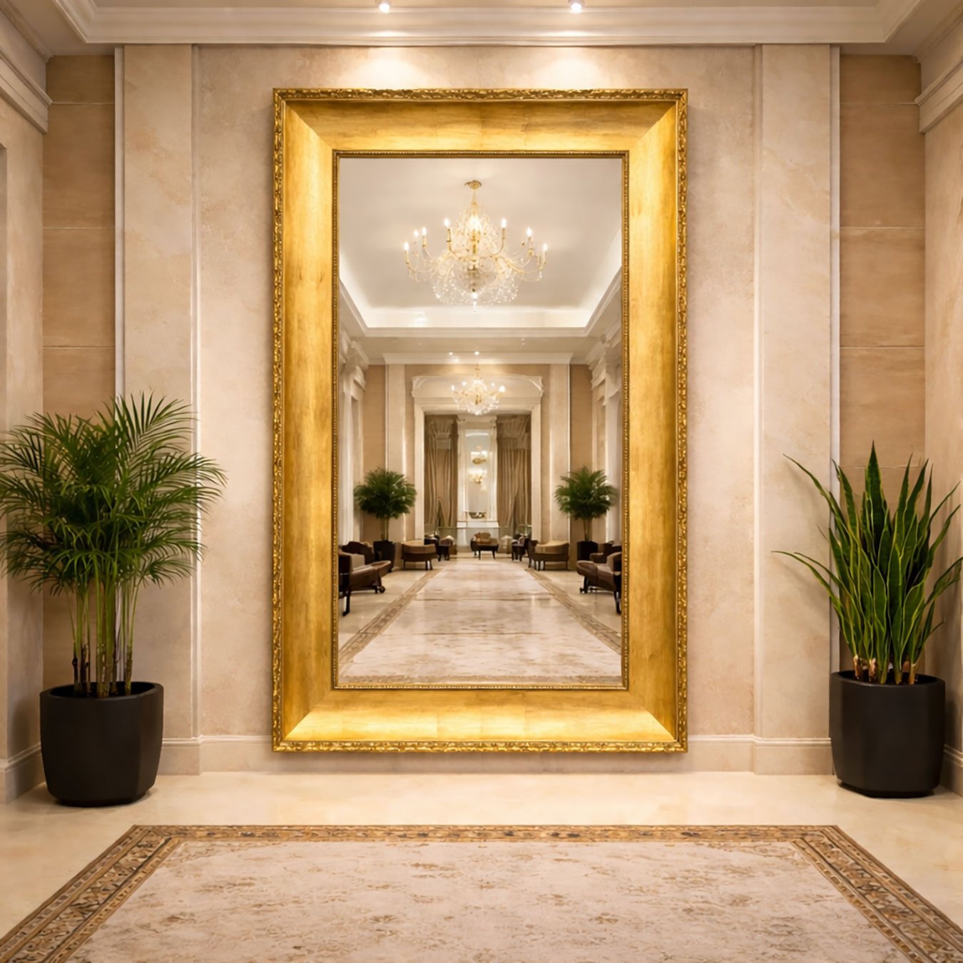Espelho Imperium ultrapassa o conceito funcional e se posiciona como um verdadeiro elemento arquitetônico. Ideal para halls de entrada luxuosos, recepções corporativas, hotéis 5 estrelas e residências sofisticadas, ele amplia o ambiente, potencializa a iluminação e agrega profundidade com elegância.