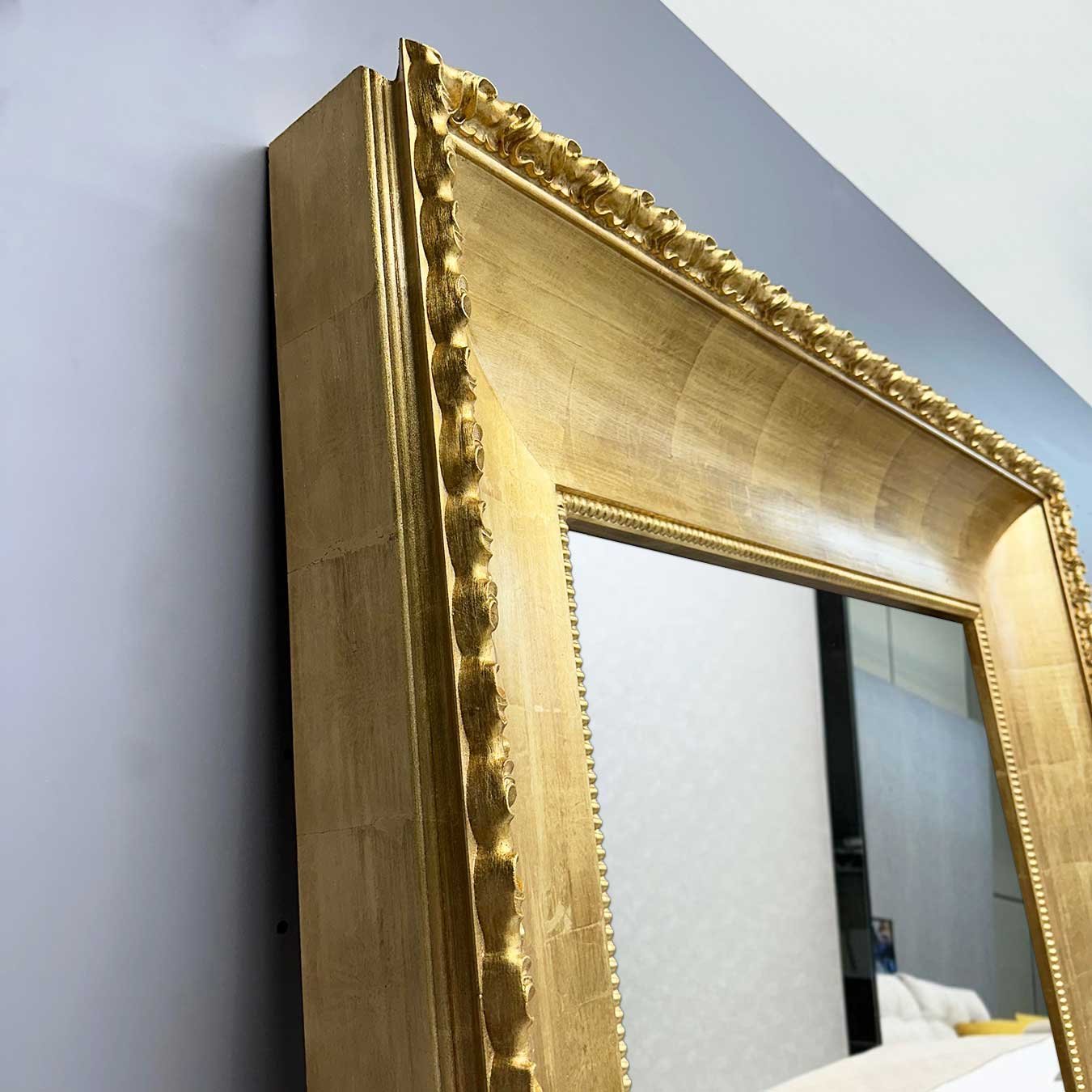 Com dimensões generosas de 150 cm de largura por 250 cm de altura, e sua moldura robusta de 26 cm de largura, com acabamento refinado e todo folheado à mão com folha ouro italiana, transmite uma estética clássica reinterpretada para projetos contemporâneos de alto padrão.
