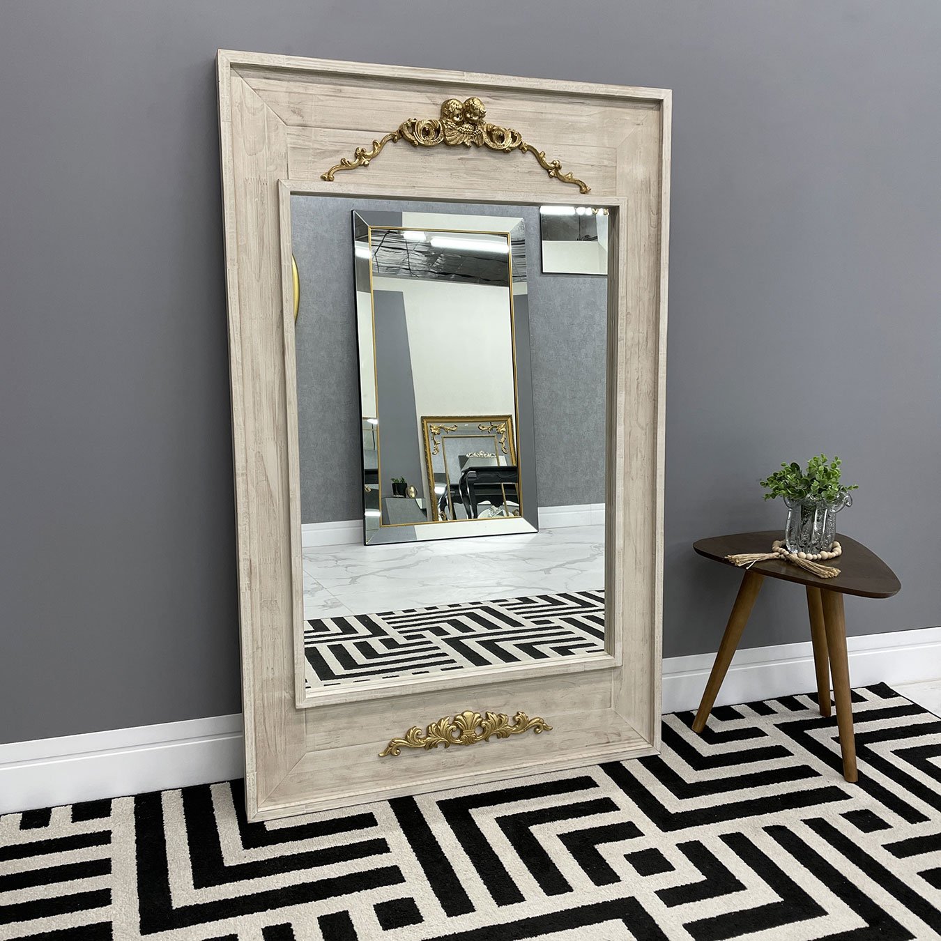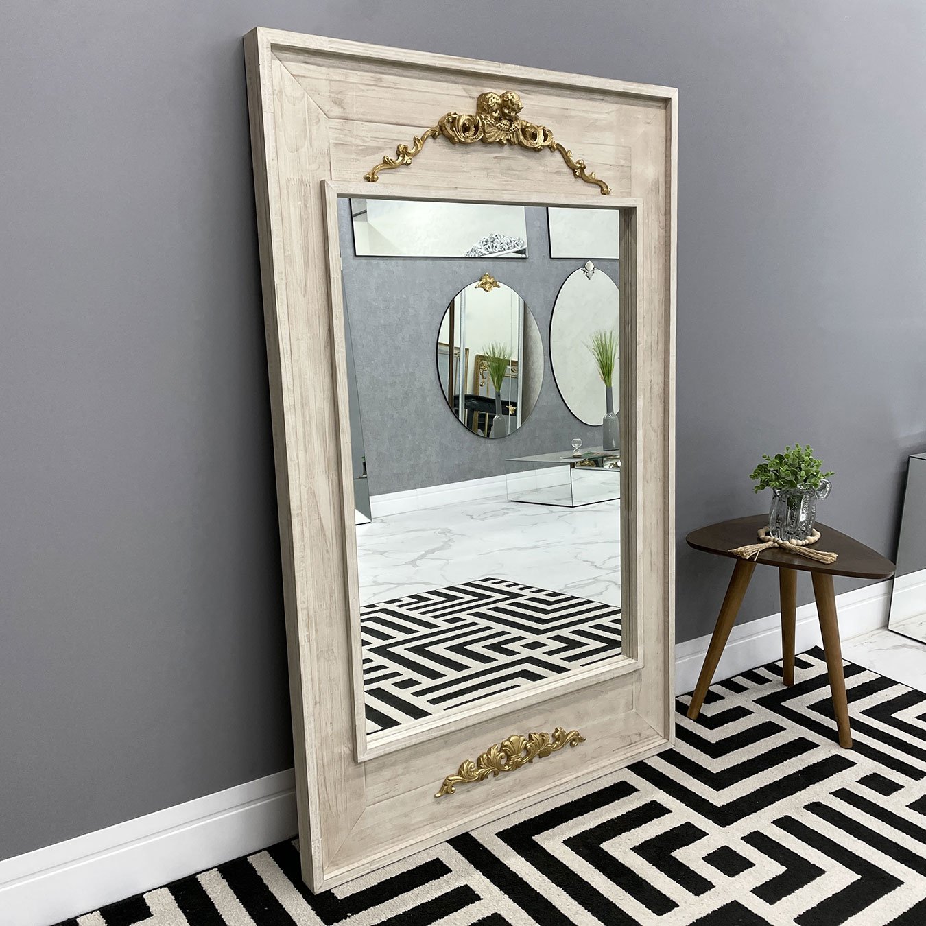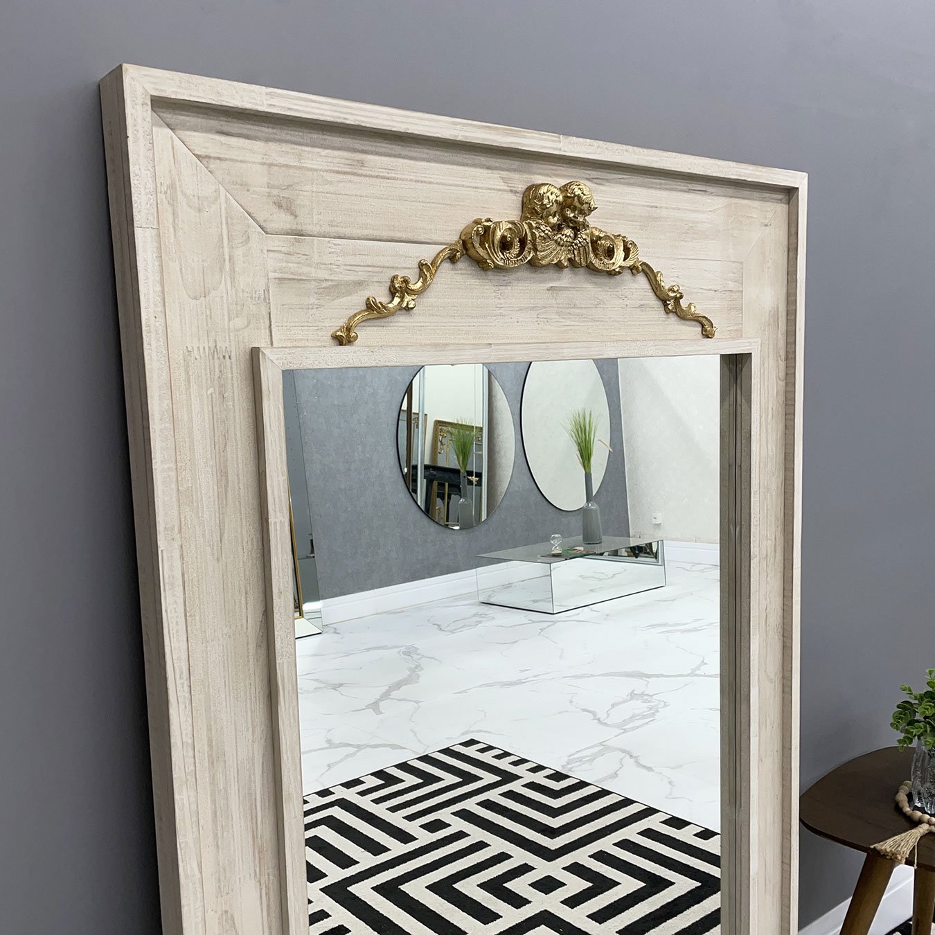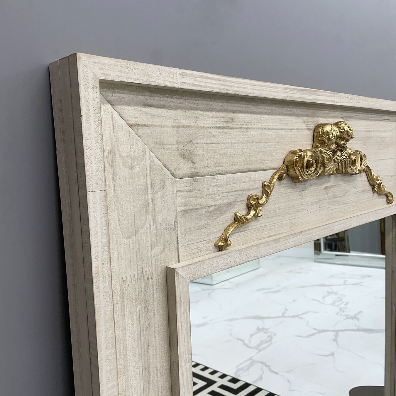 Espelho com moldura na cor branca estilo patinado com apliques na cor dourada.