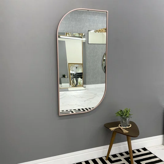 Um formato extremamente moderno e diferenciado para ser destaque na decoração do ambiente, além disso, ele é muito versátil, você pode utilizar tamanhos menores fixados na parede, e tamanhos maiores apenas apoiados na parede como espelho de chão.