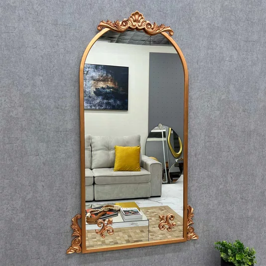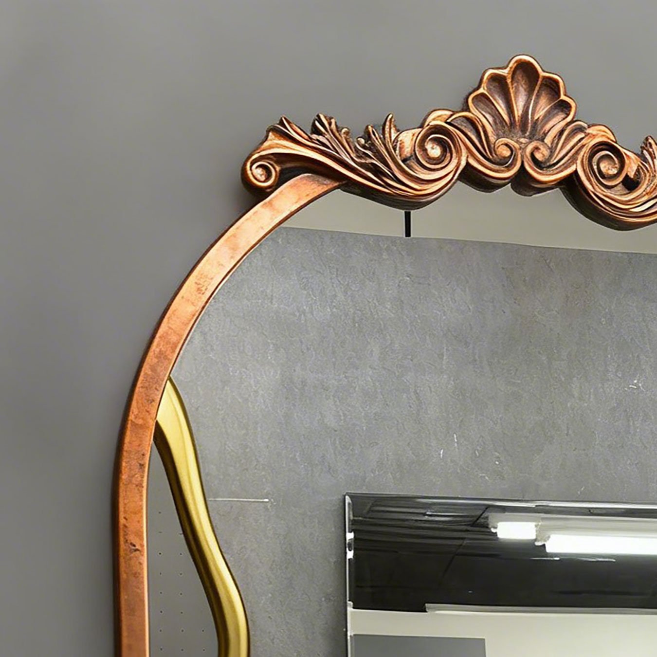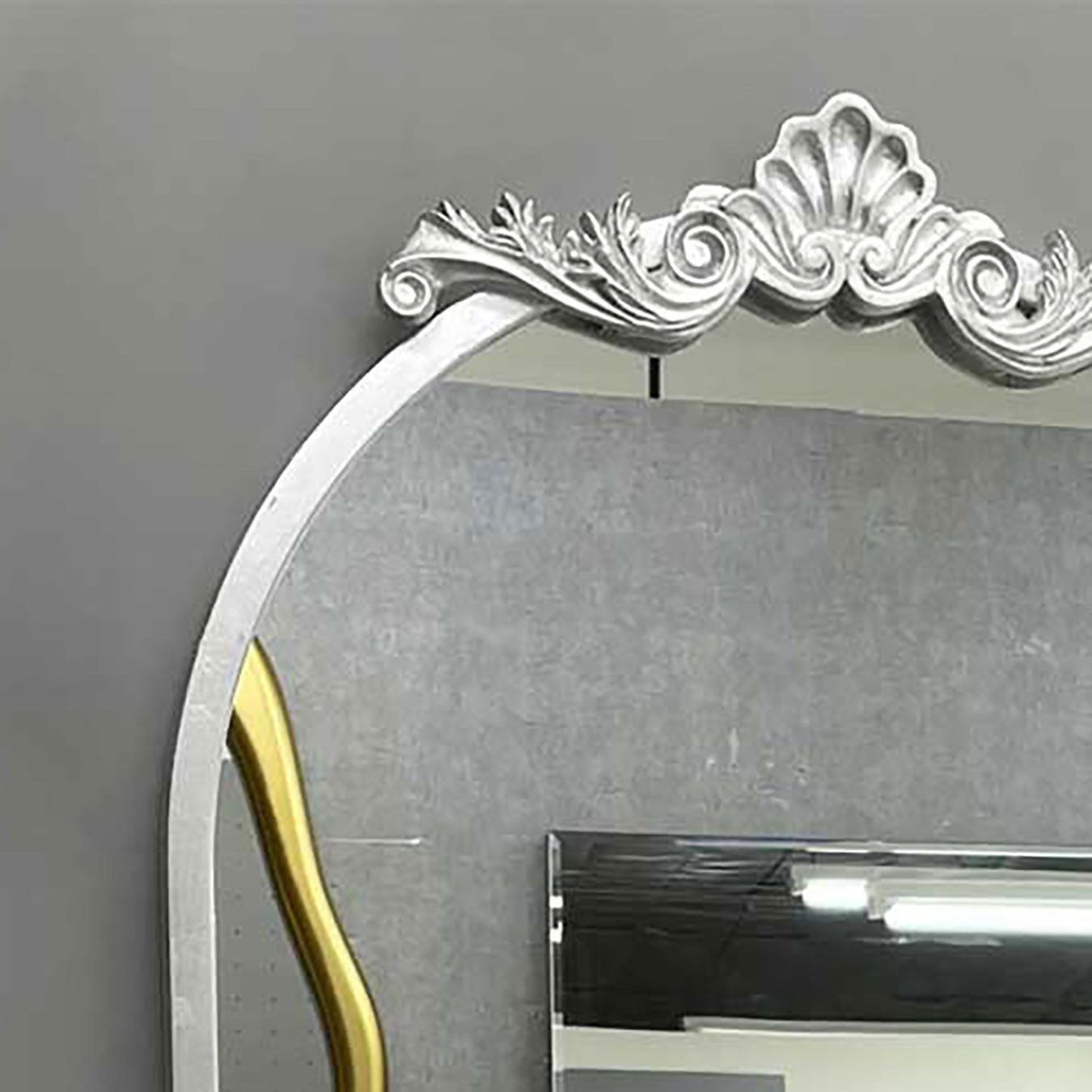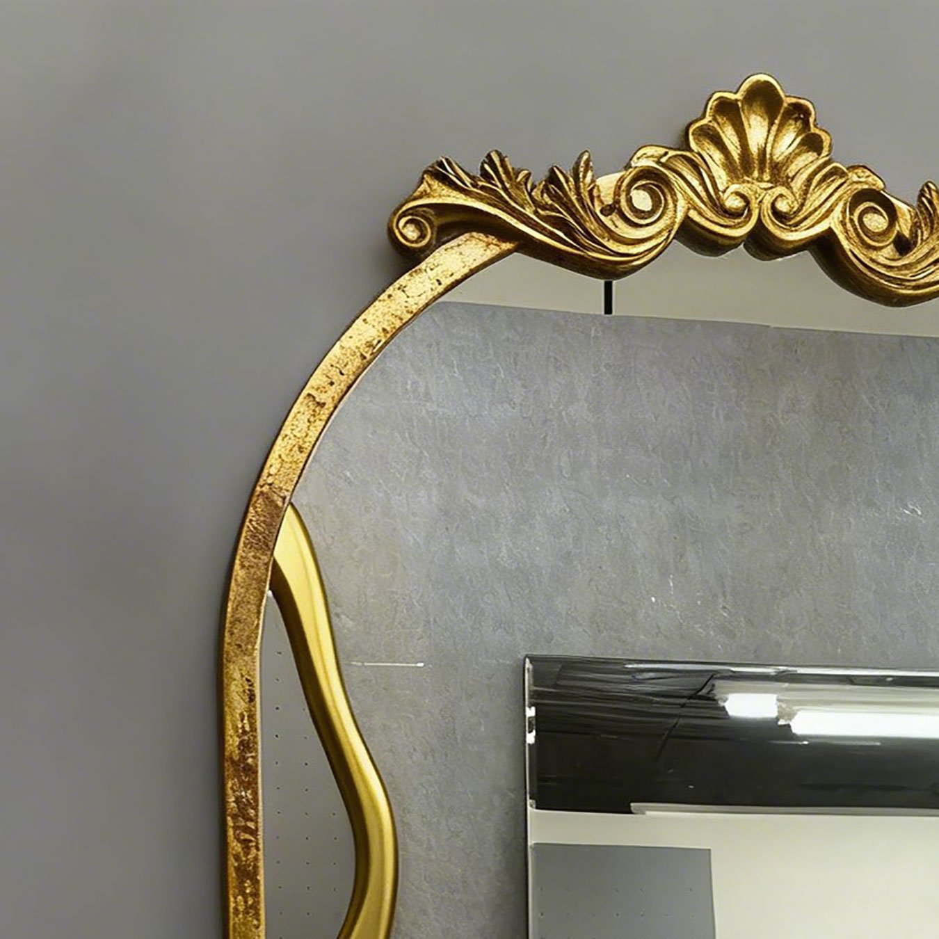 Apliques em Resina: Os apliques decorativos são feitos de resina de alta qualidade e são folheados à mão com folha ouro, prata ou cobre. Esses detalhes folheados adicionam um toque luxuoso e brilhante à moldura do espelho, realçando sua beleza e criando um contraste elegante.