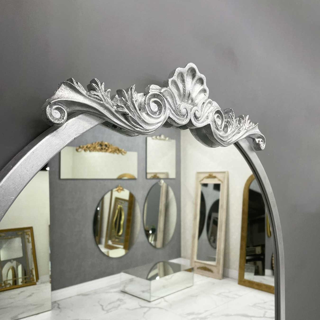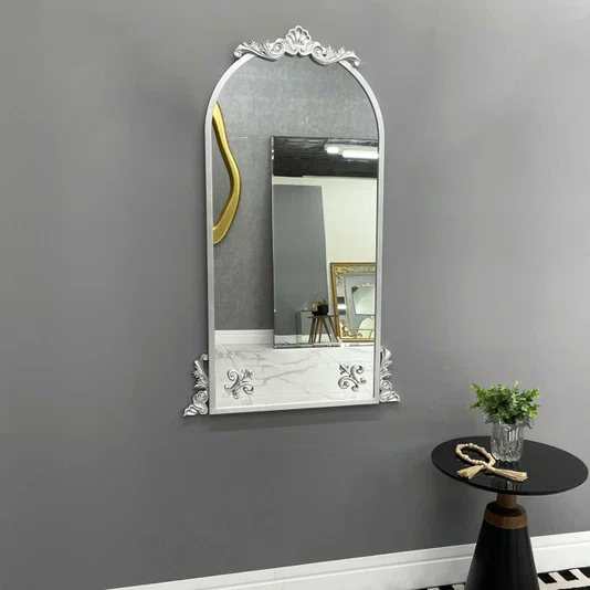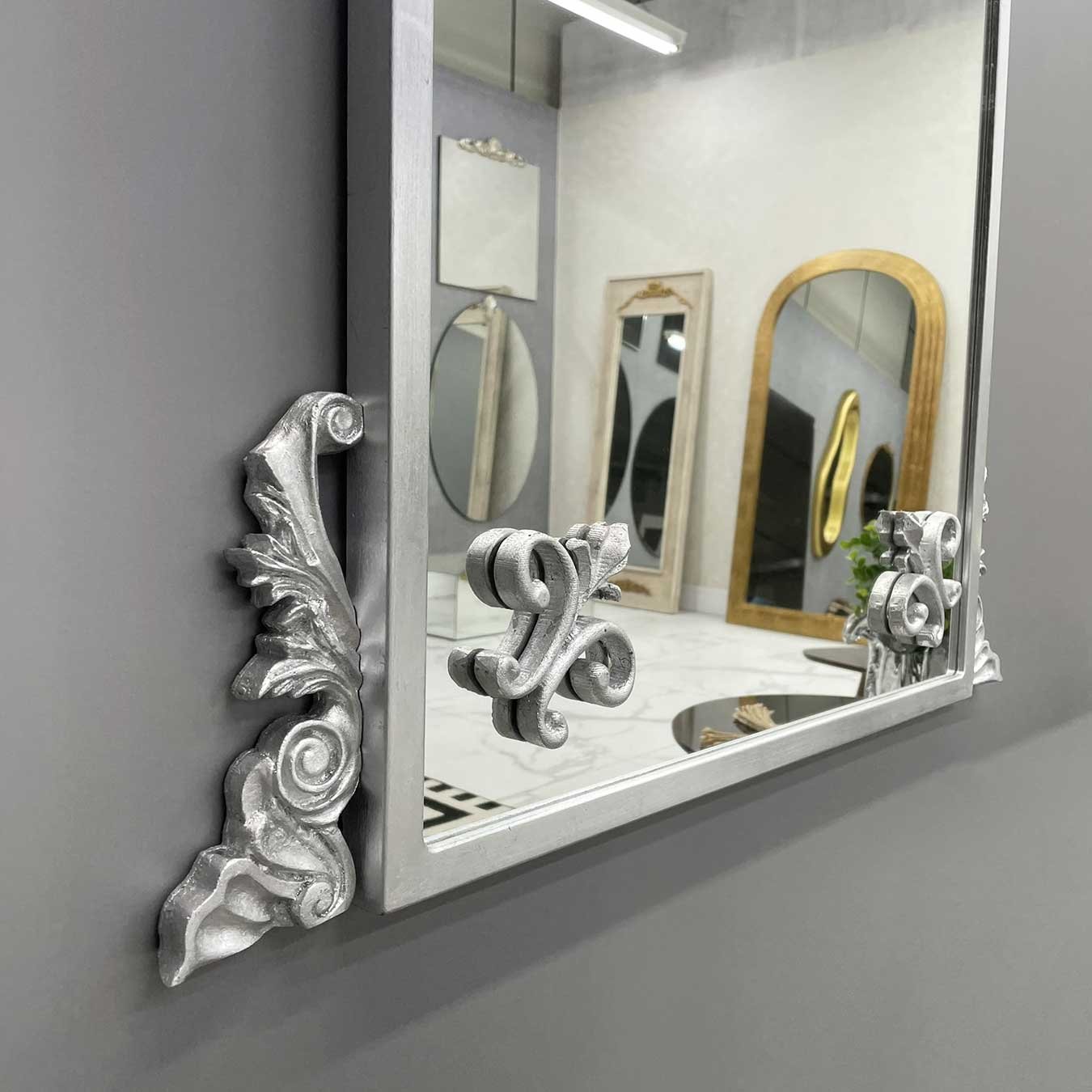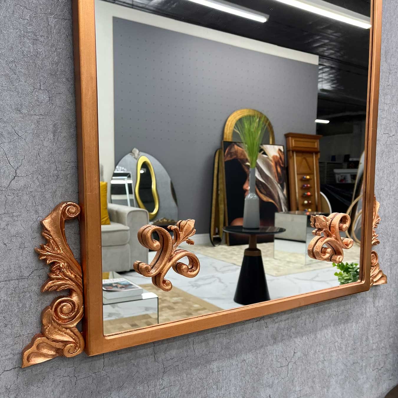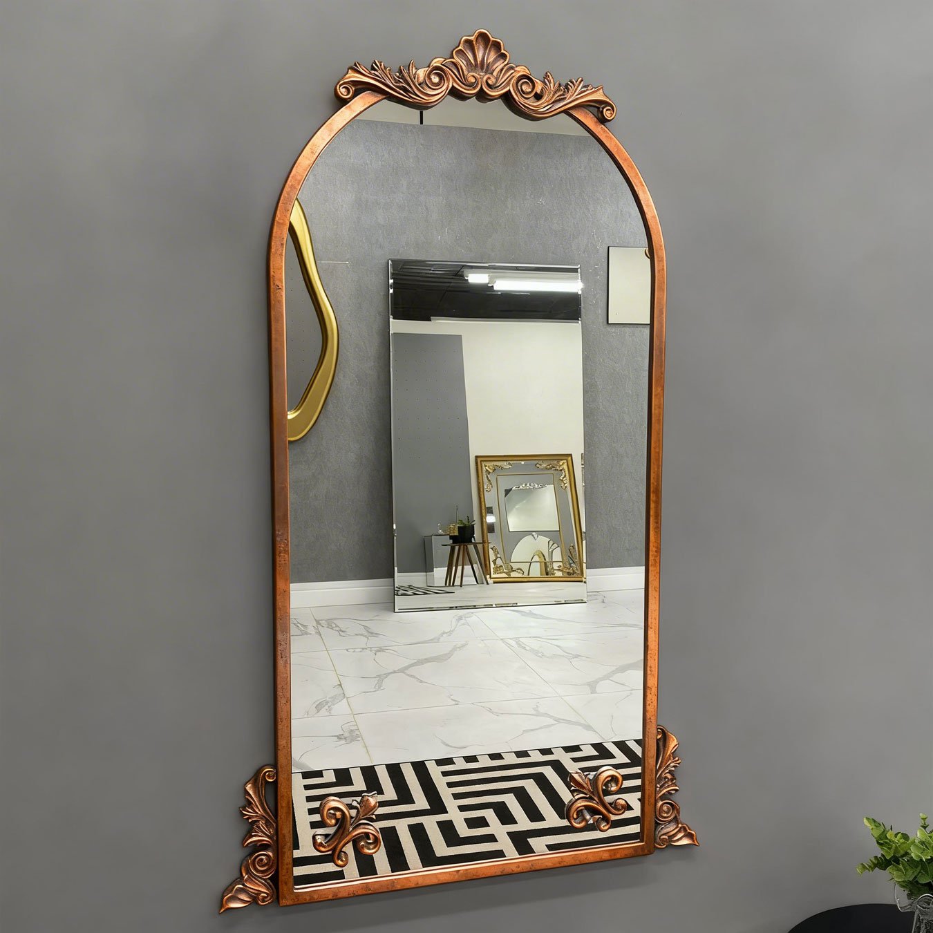 Apliques em Resina: Os apliques decorativos são feitos de resina de alta qualidade e são folheados à mão com folha ouro, prata ou cobre. Esses detalhes folheados adicionam um toque luxuoso e brilhante à moldura do espelho, realçando sua beleza e criando um contraste elegante.