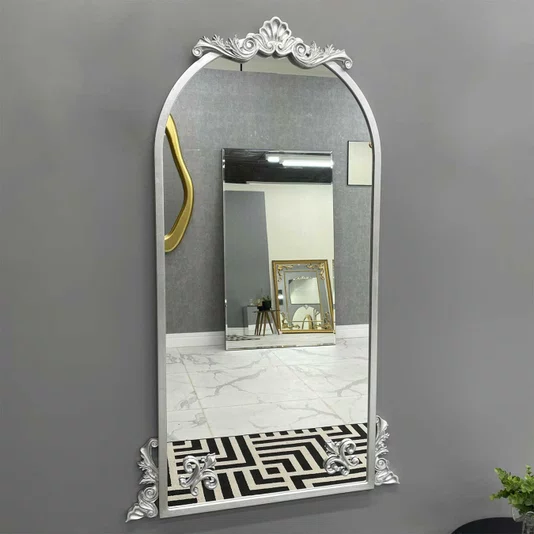 Apliques em Resina: Os apliques decorativos são feitos de resina de alta qualidade e são folheados à mão com folha ouro, prata ou cobre. Esses detalhes folheados adicionam um toque luxuoso e brilhante à moldura do espelho, realçando sua beleza e criando um contraste elegante.