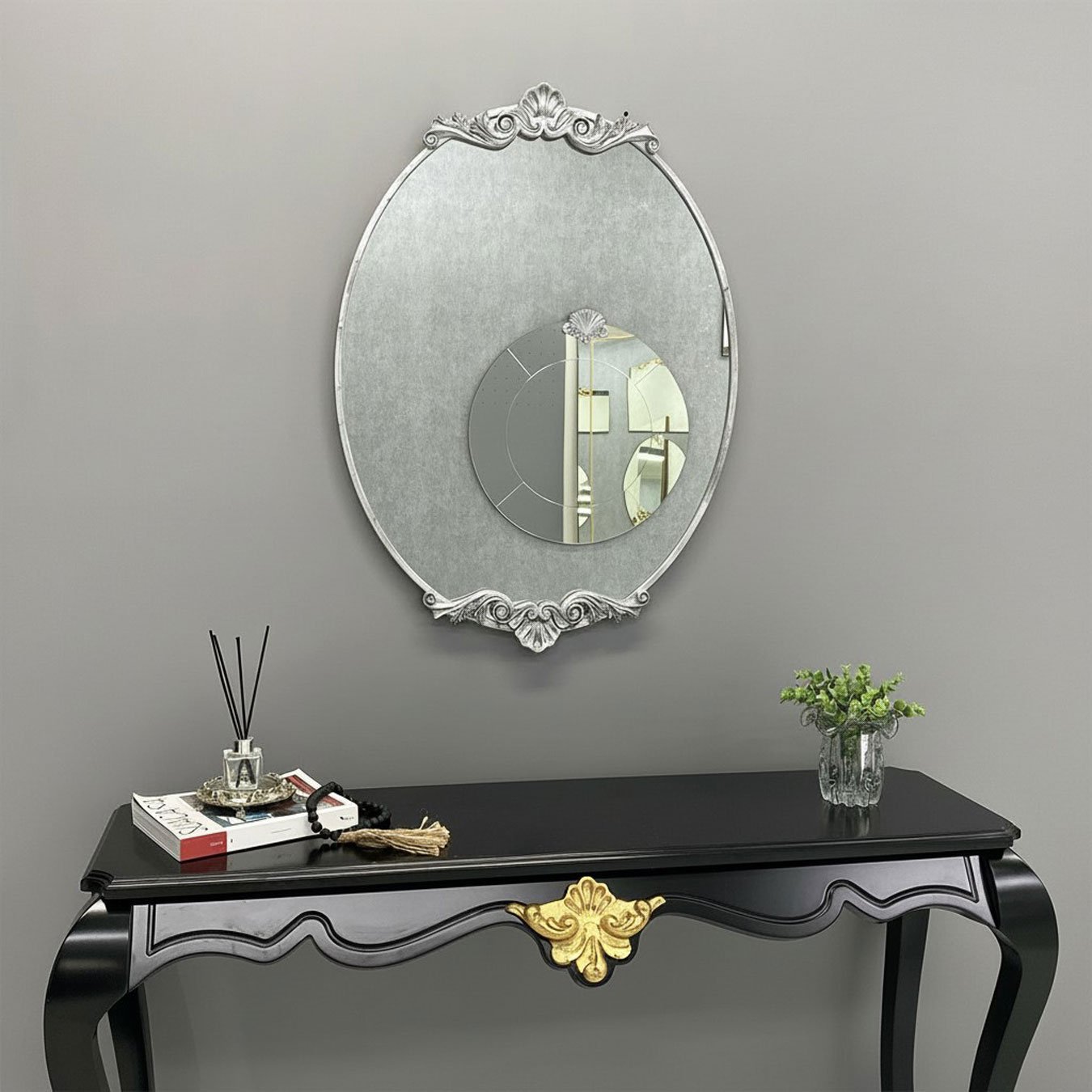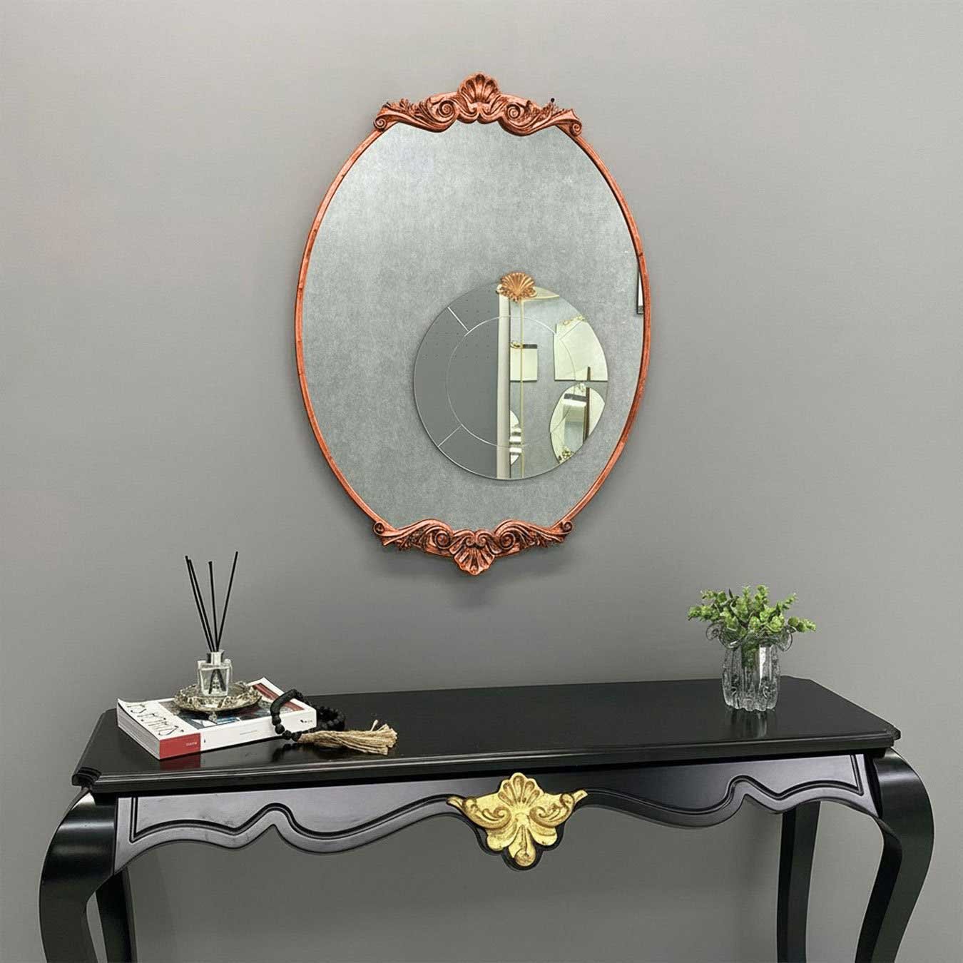 Aplique em Resina: O aplique decorativo é feito de resina de alta qualidade e é folheado à mão com folha ouro, prata ou cobre (conforme seleção). Esse detalhe folheado adiciona um toque luxuoso e brilhante à moldura do espelho, realçando sua beleza e criando um contraste elegante.