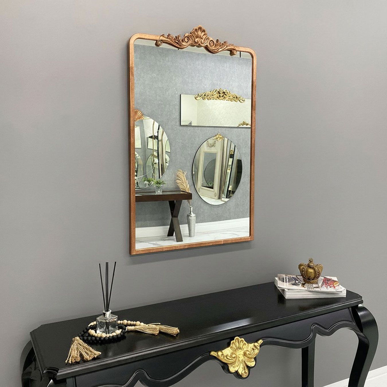 Aplique em Resina: O aplique decorativo é feito de resina de alta qualidade e é folheado à mão com folha ouro. Esse detalhe folheado adiciona um toque luxuoso e brilhante à moldura do espelho, realçando sua beleza e criando um contraste elegante.