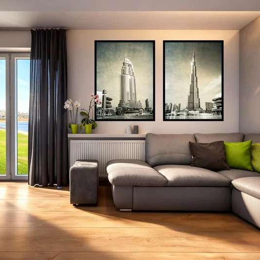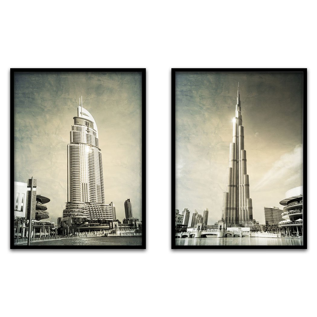 Kit 2 Quadros Burj Khalifa Imponente e Burj Al Arab Luxuoso com Moldura e Vidro