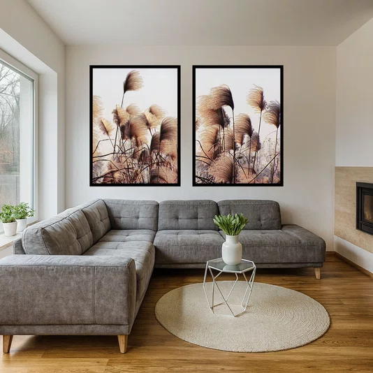 Plumas Etéreas de Flores Secas de Junco que Inspiram Serenidade no Kit de Quadros para Sala