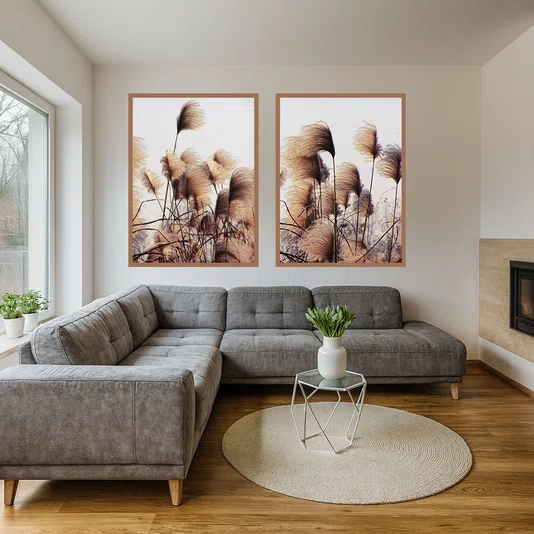 Plumas Etéreas de Flores Secas de Junco que Inspiram Serenidade no Kit de Quadros para Sala