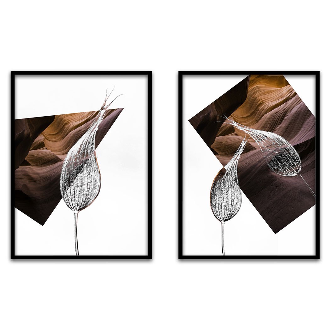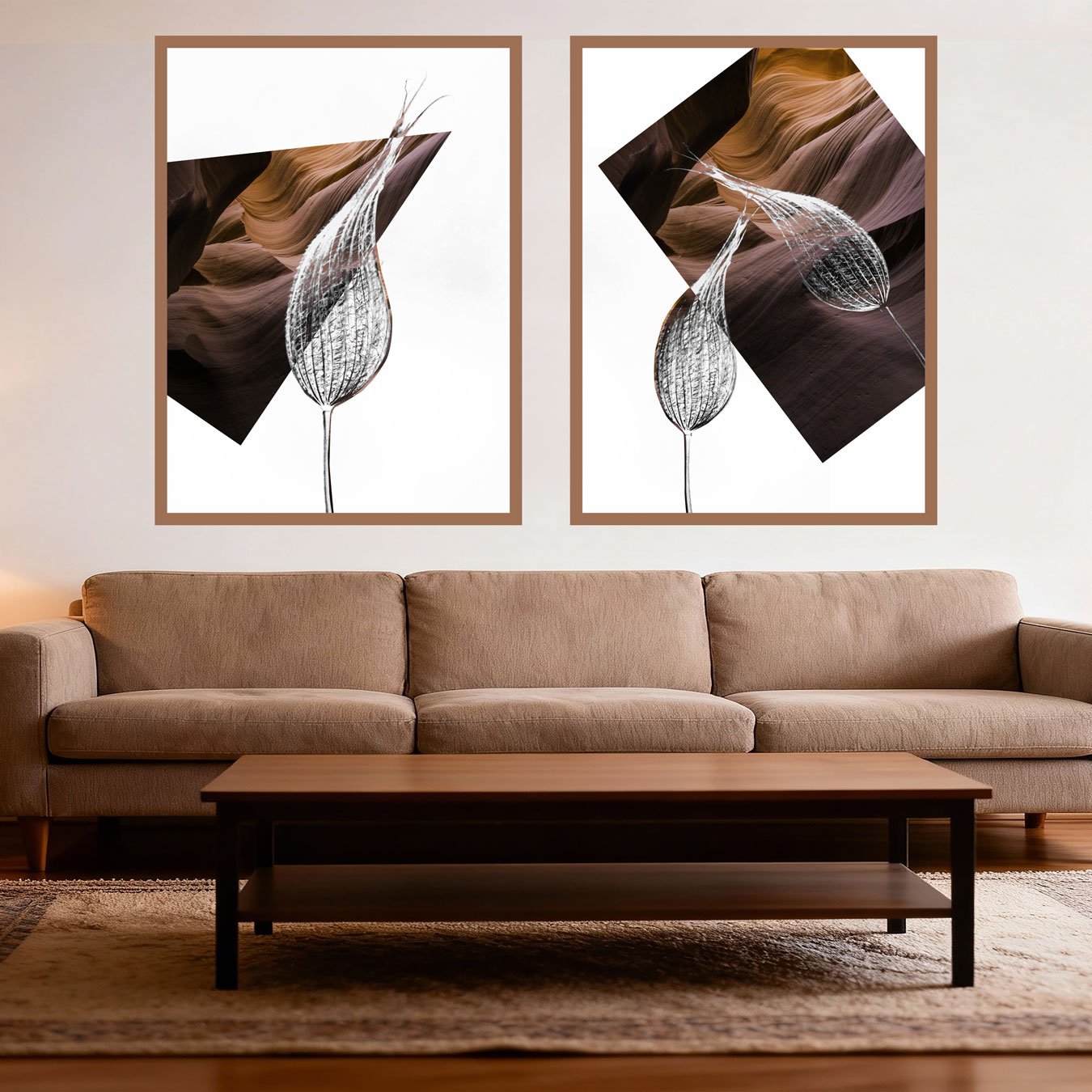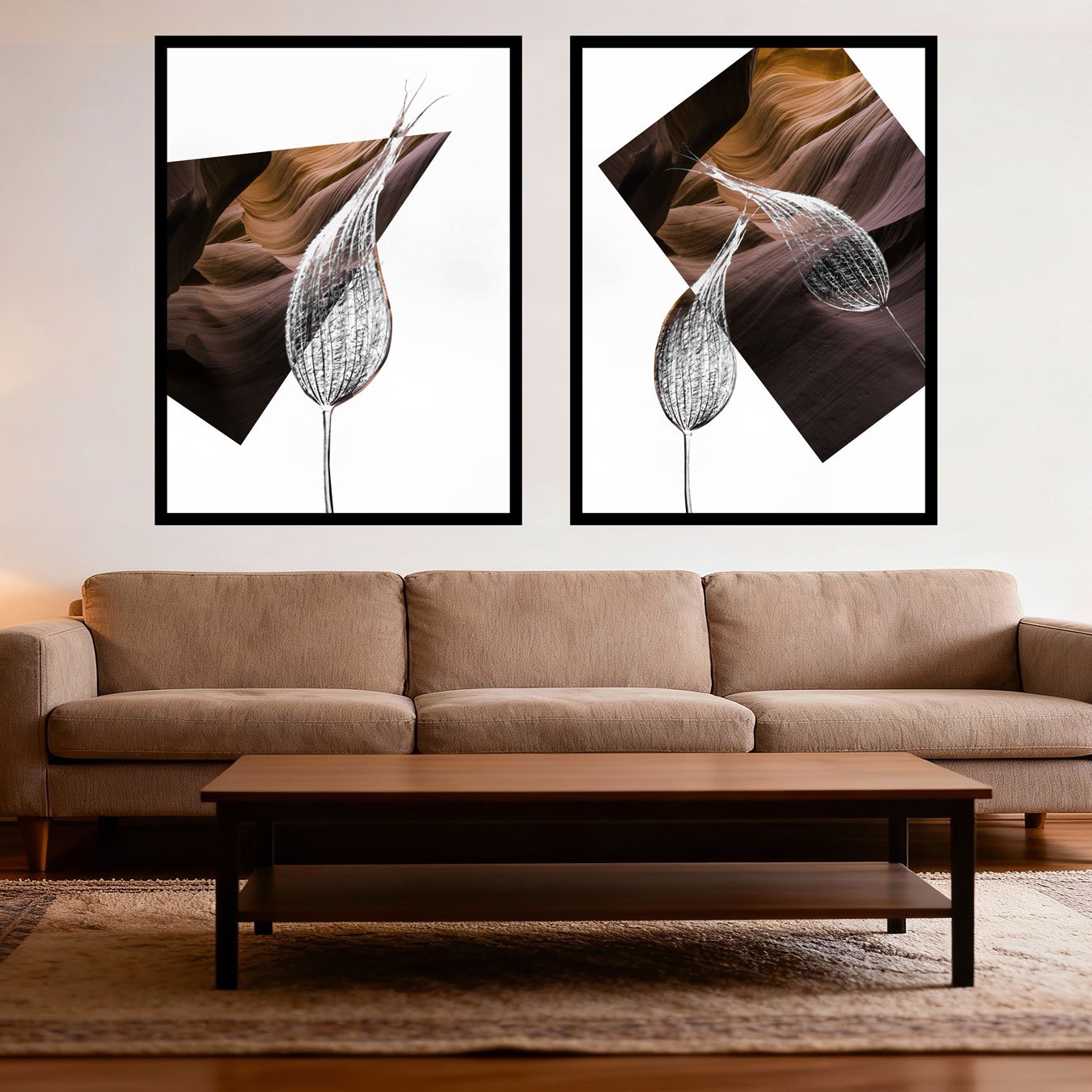 Kit 2 Quadros de Flores Metálicas e Arte Moderna Abstrata com Moldura e Vidro