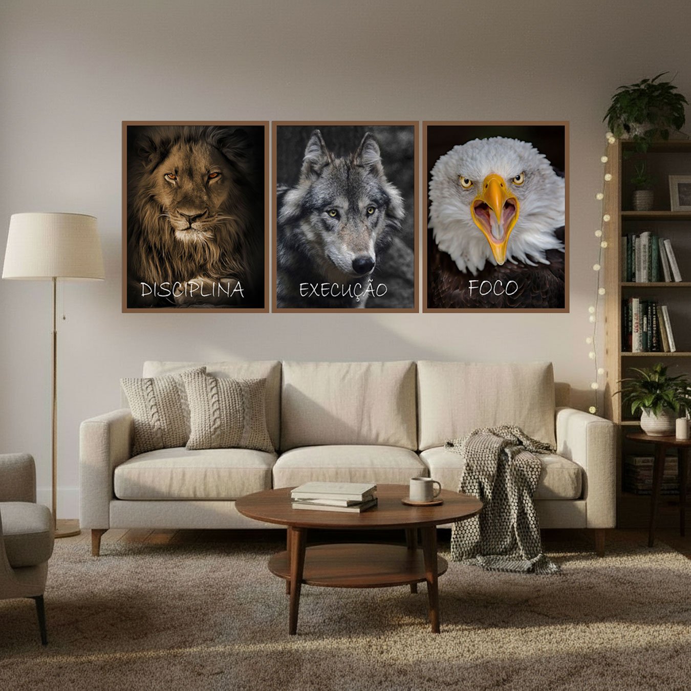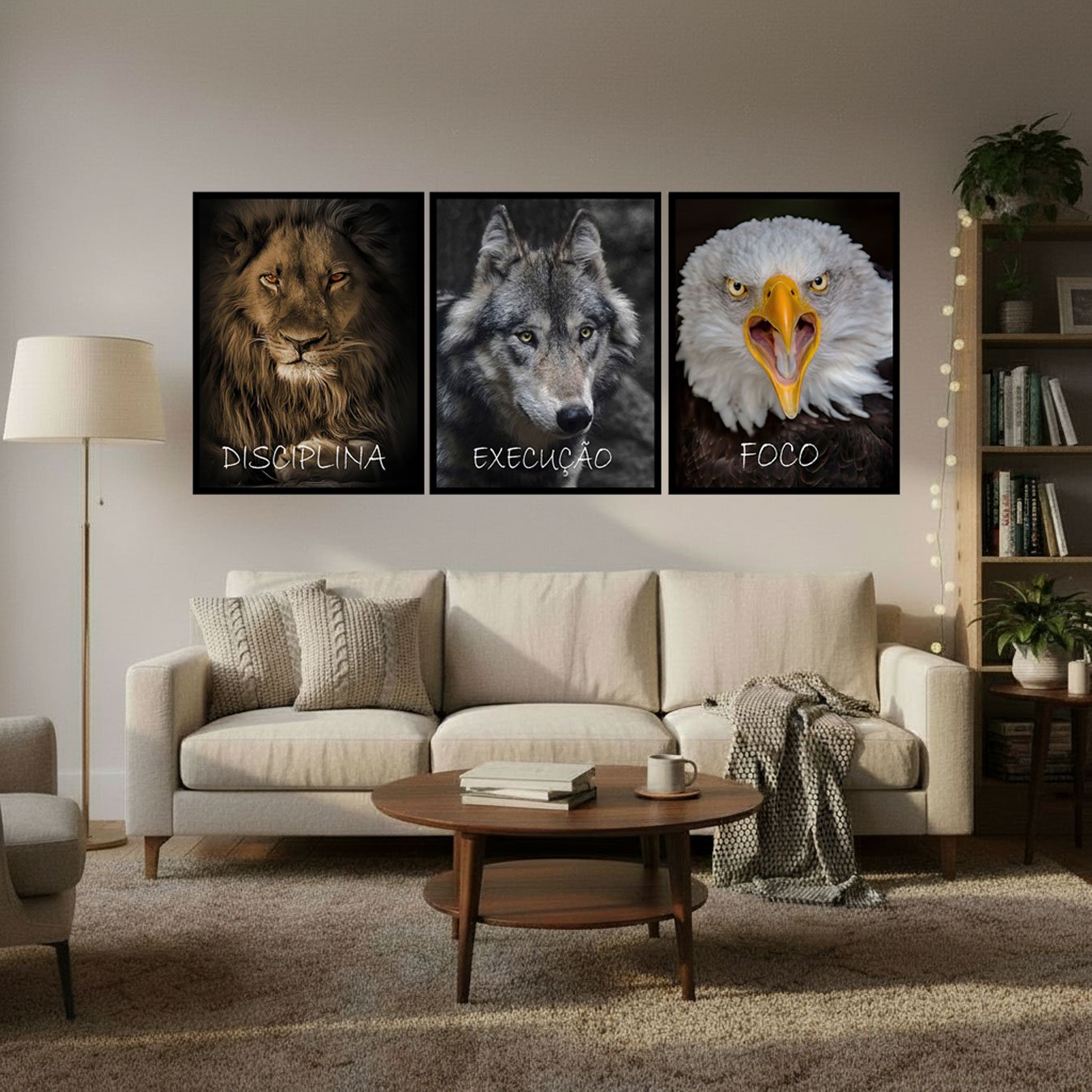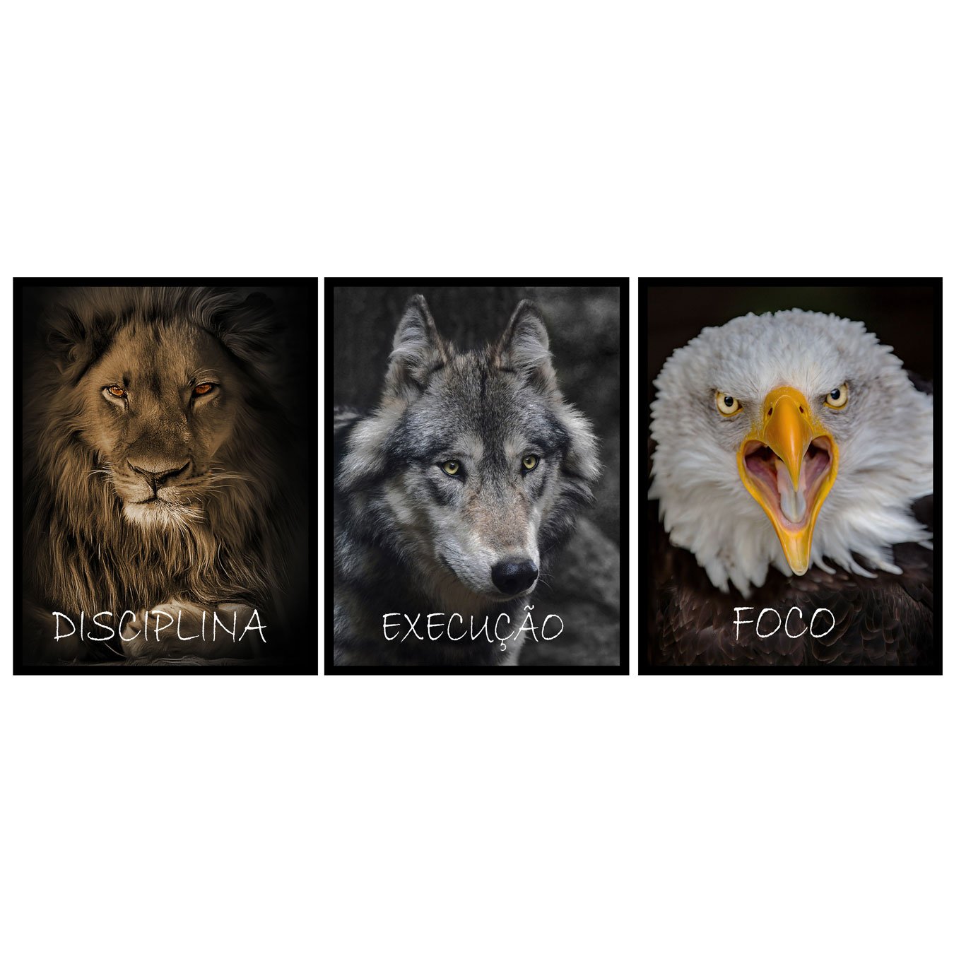 Kit de Quadros Animais Poderosos Disciplina Leão, Execução Lobo e Foco Águia
