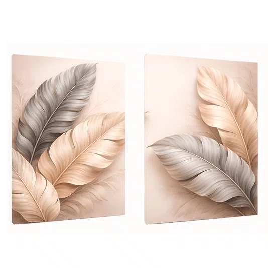 Kit de Quadros Folhas Minimalistas Bege e Cinza Prateado Elegante Sofisticado