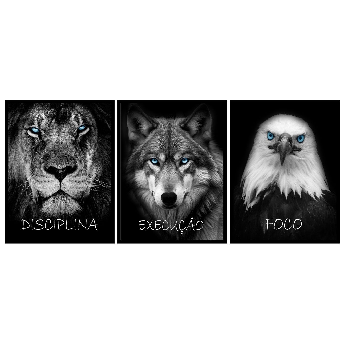 Kit Quadros Motivacionais Animais, Leão Disciplina, Lobo Execução e Águia Foco