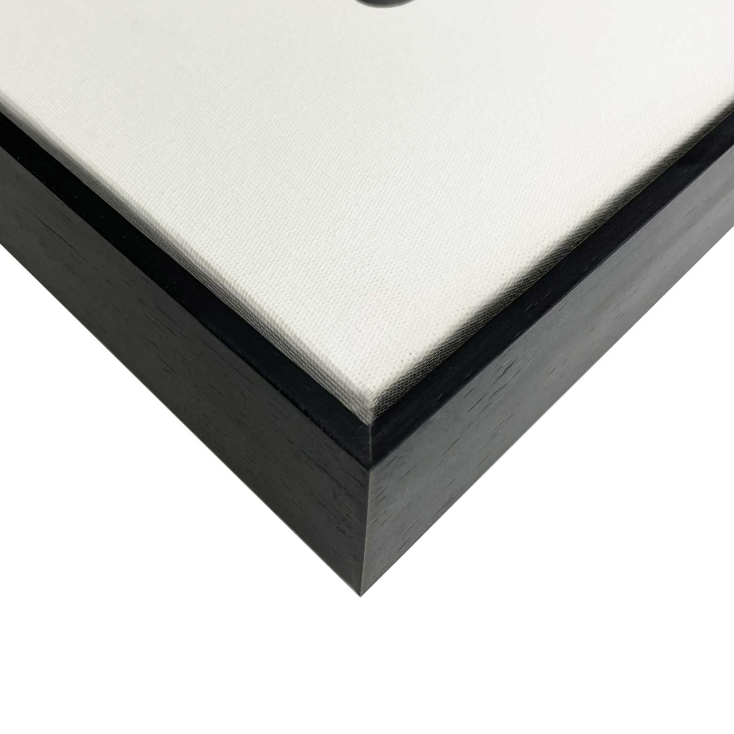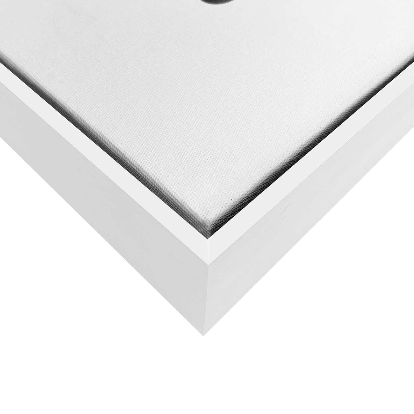 Molduras do tipo Flutuante: A moldura em Madeira Maciça chamada de escadinha flutuante, com dimensão de 0,5x4,4cm, garante uma imagem sutil em que parece flutuar dentro da moldura. A impressão é feita em Tecido Canvas esticado em chassi de madeira maciça e que não necessita do uso de vidro de proteção (não acompanha vidro neste formato).