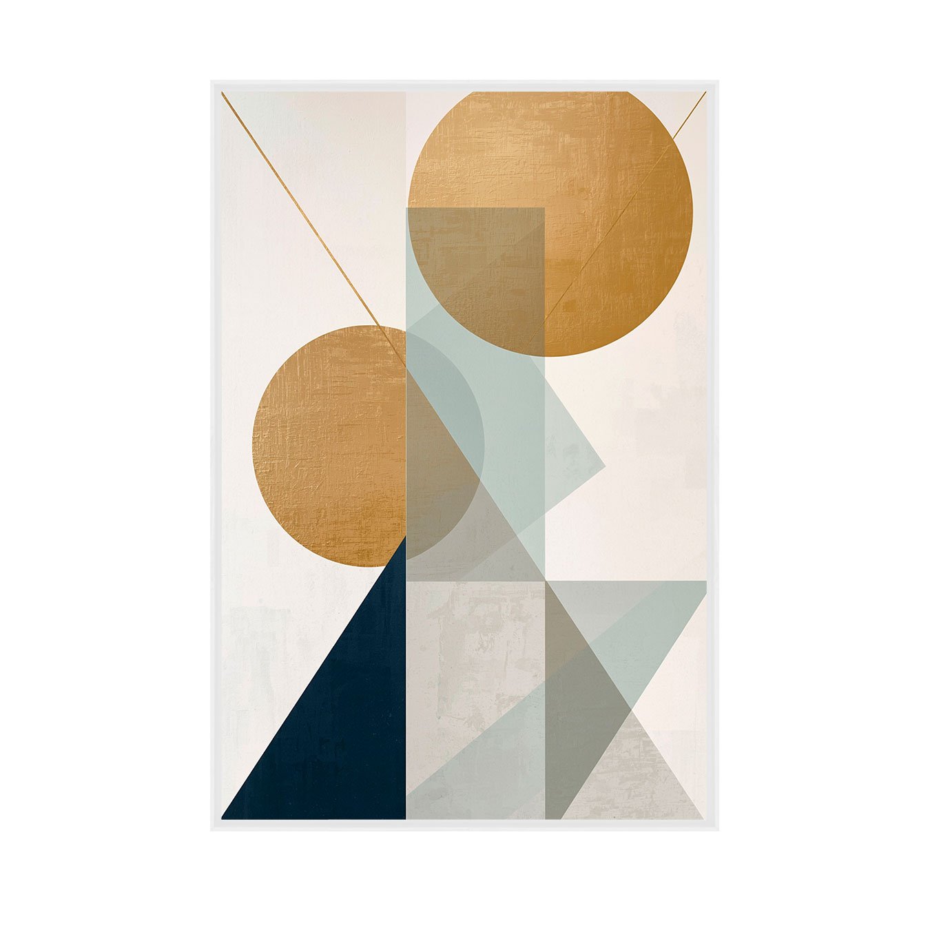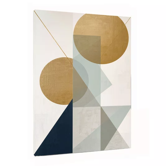 O Quadro Abstrato Geométrico Círculos Dourados e Elementos Sálvia e Marinho é a tradução da sofisticação moderna para paredes que exigem personalidade. Esta obra de arte abstrata apresenta uma composição equilibrada de círculos em tom mostarda e ouro, sobrepostos a uma estrutura vertical em verde-sálvia, ancorada por um triângulo azul-marinho profundo que confere peso visual e elegância ao conjunto.