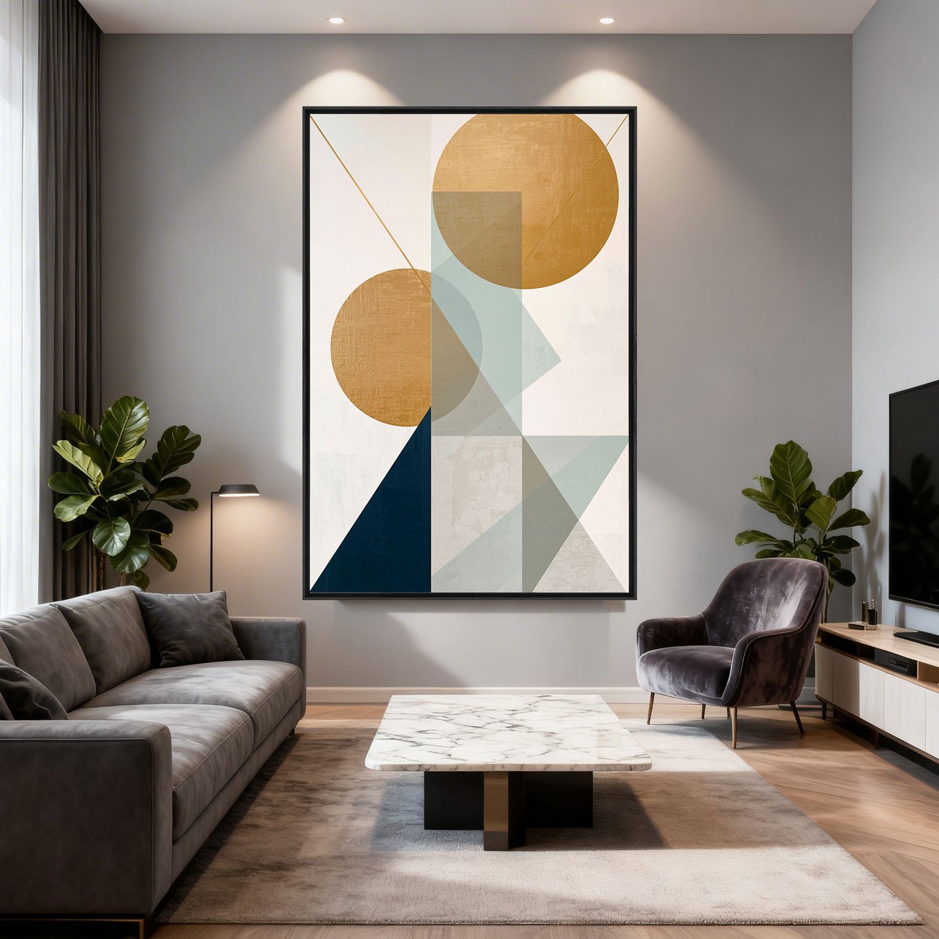 Quadro Abstrato Geométrico Círculos Dourados e Elementos Sálvia e Marinho