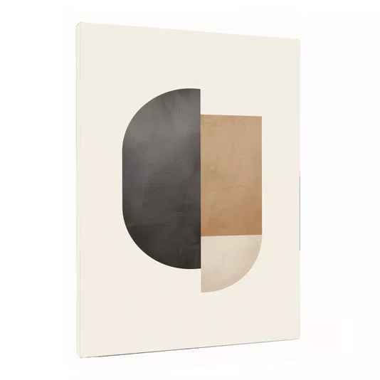 O Quadro Abstrato Geométrico apresenta composição minimalista com formas orgânicas e retangulares em harmonia visual perfeita. A paleta sofisticada combina cinza escuro, bege terroso e creme, criando um contraste elegante que complementa ambientes modernos e contemporâneos.