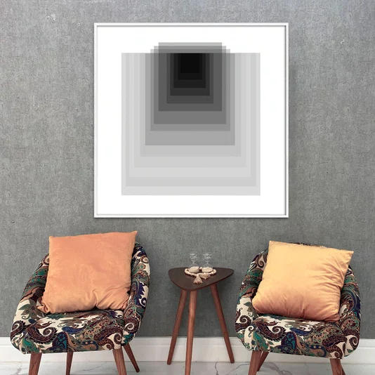 Com um design geométrico minimalista, o quadro apresenta uma sequência fascinante de formas que se aninham umas dentro das outras, criando um efeito de profundidade impressionante. A paleta preto e branco, enriquecida por uma gradação sutil de tons de cinza, simula um túnel infinito ou um portal, adicionando mistério e dimensão à sua parede. É uma exploração da luz e sombra que transforma o espaço.