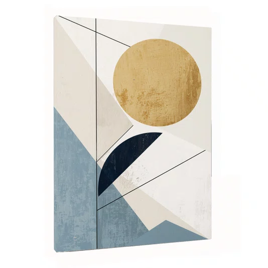 Quadro Abstrato Minimalista Sol Dourado e Formas Geométricas Azul Sereno