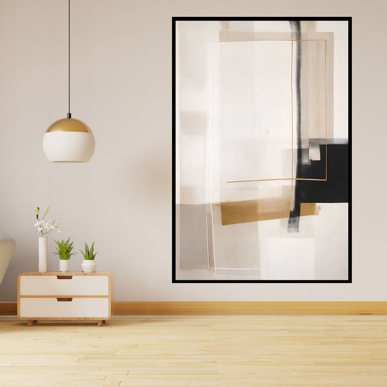 Os tons predominantes são off-white/creme e bege/areia, que criam uma base leve e luminosa. Sobre essa base, surgem blocos e faixas em cinza grafite e um preto profundo (principalmente no lado direito), trazendo peso visual e um efeito de alto contraste. Para finalizar, o quadro recebe acentos em dourado/bronze em linhas delicadas, que adicionam calor e um toque de luxo sem perder a sobriedade da paleta.