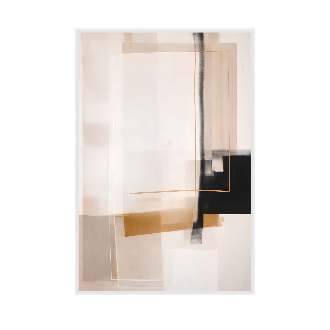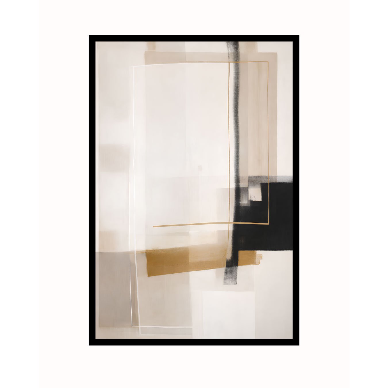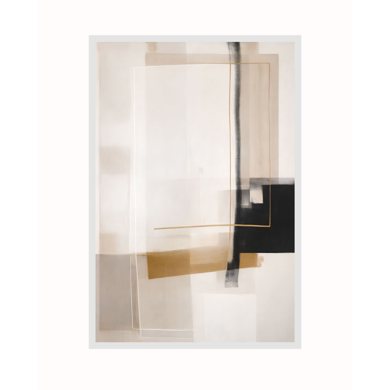 Este quadro abstrato e geométrico combina formas retangulares e linhas finas em uma composição contemporânea e minimalista, com sensação de camadas e profundidade. A estética é sofisticada, ideal para ambientes modernos, pois equilibra áreas claras amplas com um contraste marcante em preto e detalhes metálicos discretos.