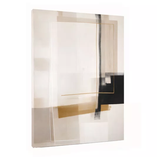 Este quadro abstrato e geométrico combina formas retangulares e linhas finas em uma composição contemporânea e minimalista, com sensação de camadas e profundidade. A estética é sofisticada, ideal para ambientes modernos, pois equilibra áreas claras amplas com um contraste marcante em preto e detalhes metálicos discretos.