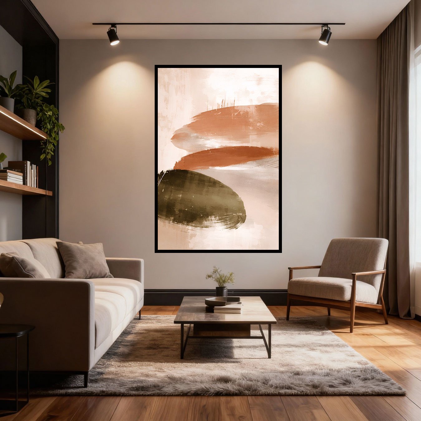 O Quadro Abstrato Orgânico em Tons Terrosos Verde Oliva e Terracota Moderno traz uma composição contemporânea com formas orgânicas e pinceladas amplas, criando um visual equilibrado entre suavidade e presença. A obra se constrói em camadas, com um fundo claro em creme/off-white que valoriza os contrastes dos elementos principais em verde oliva profundo e terracota queimado, além de transições sutis em taupe e cinza.