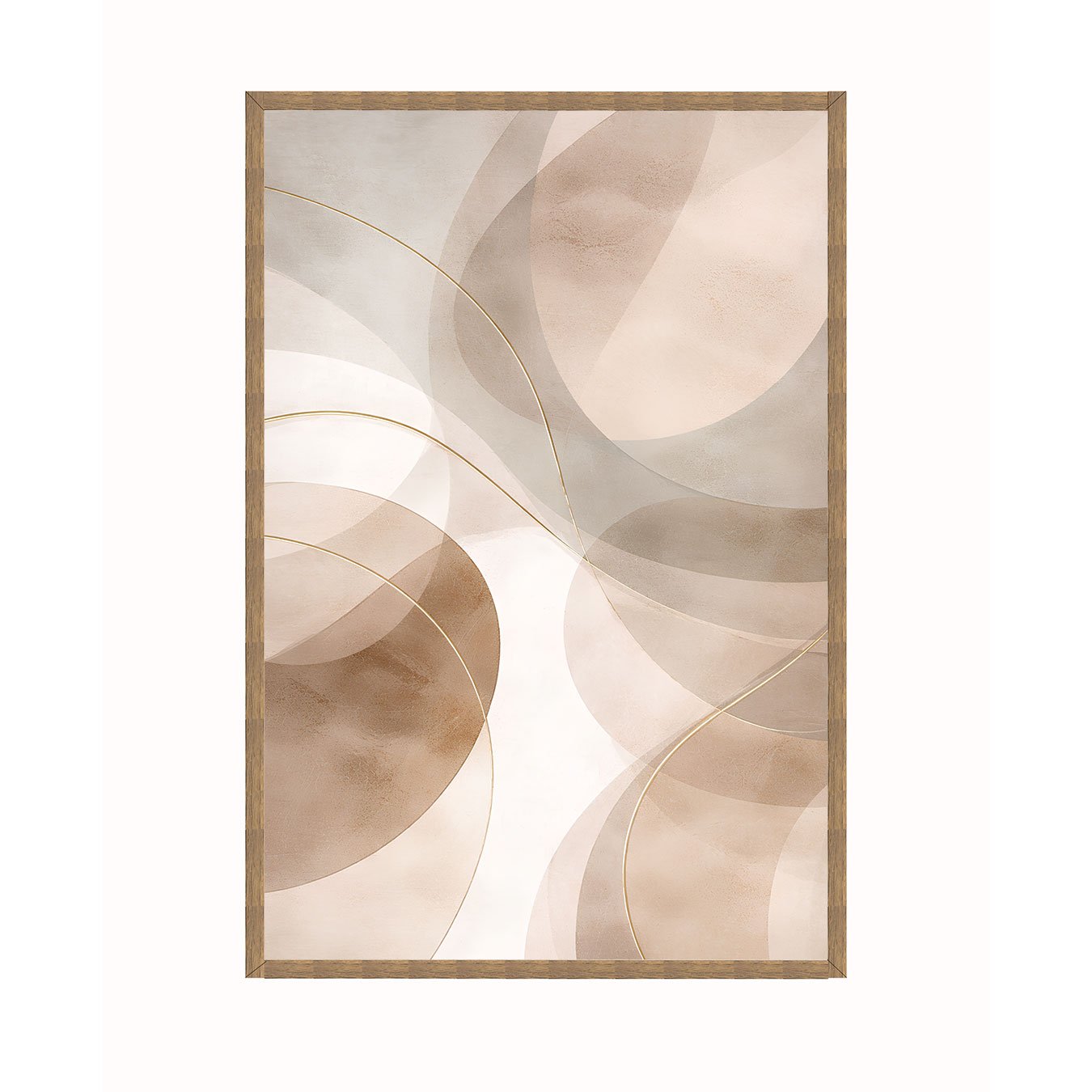 Quadro Abstrato Neutro Formas Circulares e Linhas Douradas em Tons Terrosos