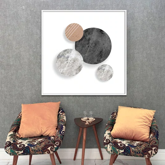 Realce a decoração do seu espaço com este quadro decorativo abstrato minimalista composto por formas circulares em texturas de mármore e papel. A arte combina tons sóbrios e neutros com um design clean, sendo perfeita para salas, quartos e ambientes corporativos modernos. A moldura externa valoriza a luminosidade do quadro e traz leveza para qualquer parede, harmonizando com estilos escandinavos, contemporâneos ou minimalistas.