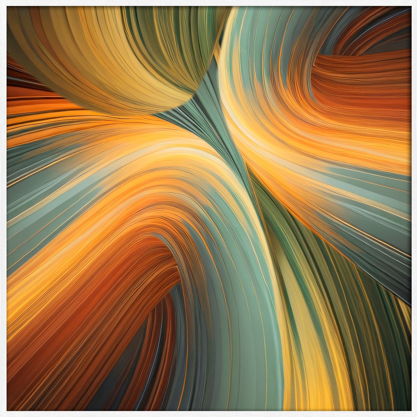 A composição é uma tapeçaria intrincada de fitas ou camadas que se dobram e se entrelaçam, criando uma ilusão fascinante de relevo tridimensional. O olhar é convidado a seguir o fluxo orgânico das linhas, que se movem com uma elegância quase hipnótica, sugerindo uma dança contínua e um dinamismo cativante.