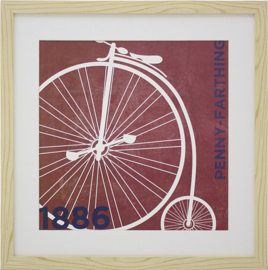 Quadro decorativo retrô moldura com aspecto de madeira crua. Bicicleta antiga de roda dianteira grande.