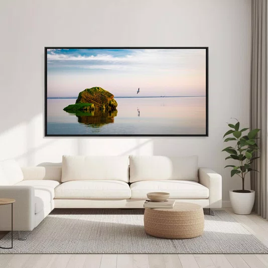 A escolha de uma arte de paisagem com lago e entardecer está diretamente associada a sensações de calma, introspecção e sofisticação. O contraste entre a rocha verde e o céu em transição cromática cria um ponto focal marcante, sem pesar visualmente o ambiente.