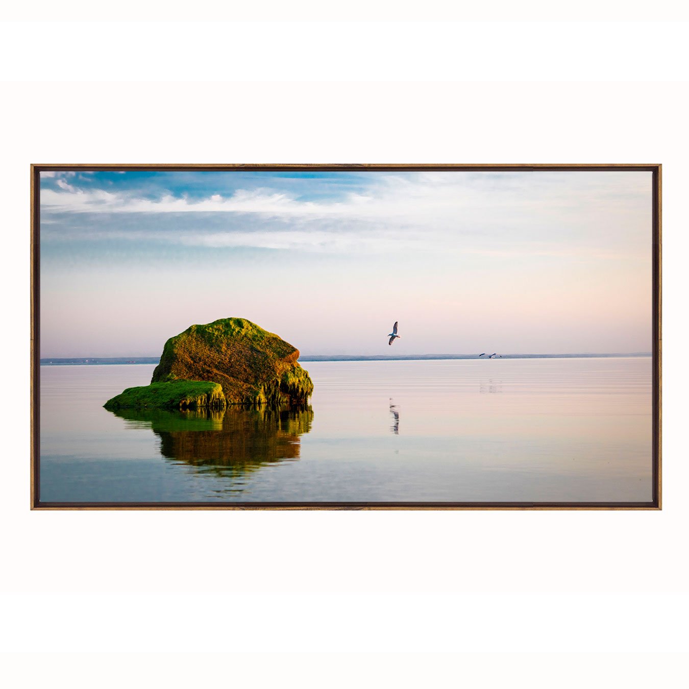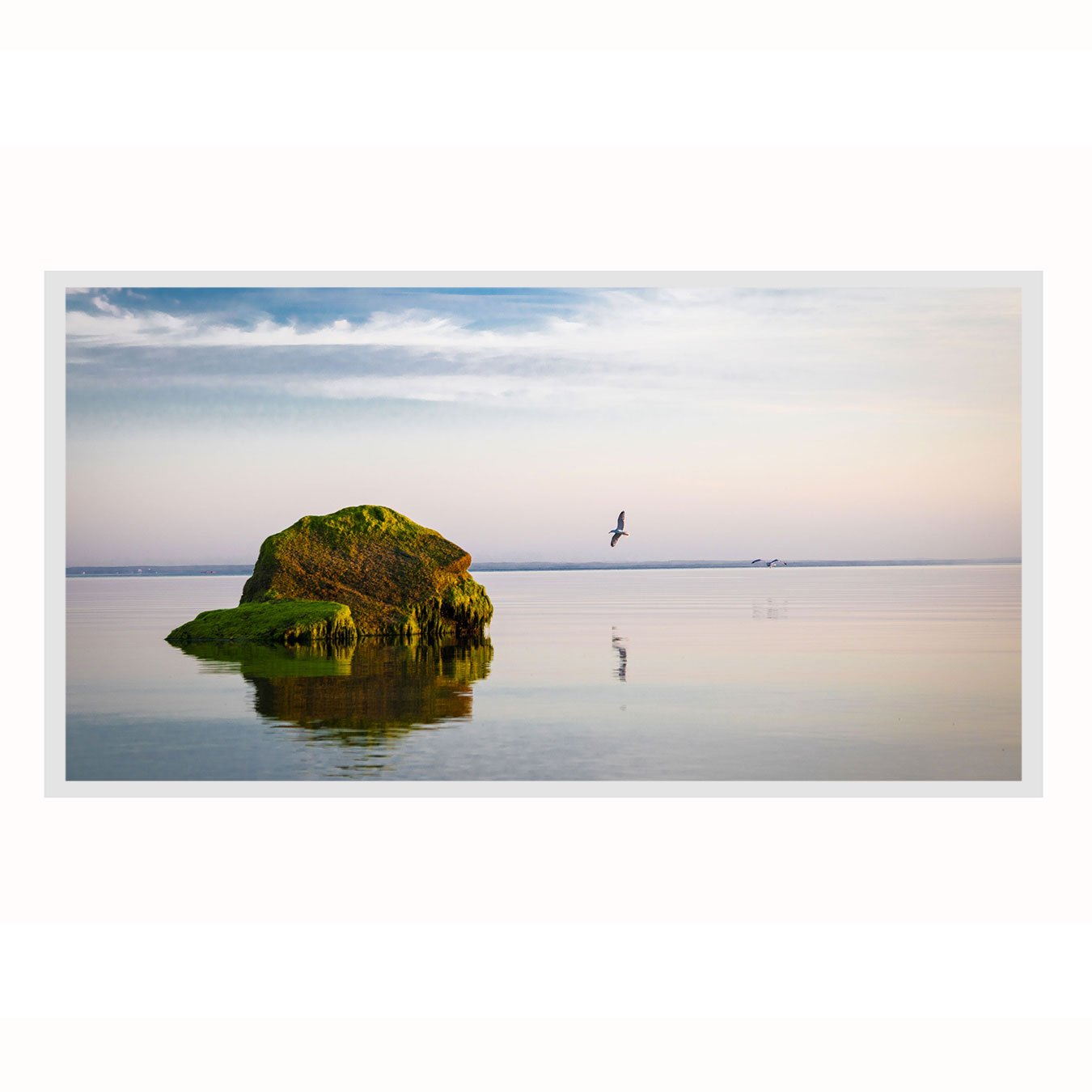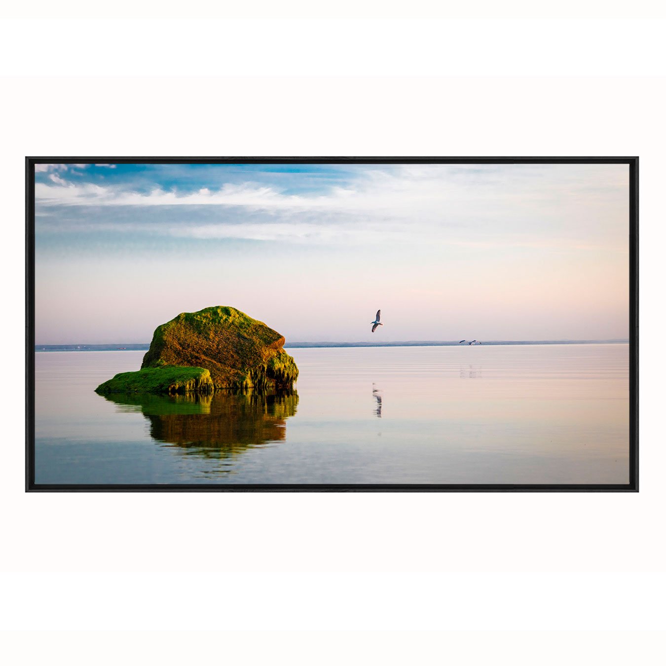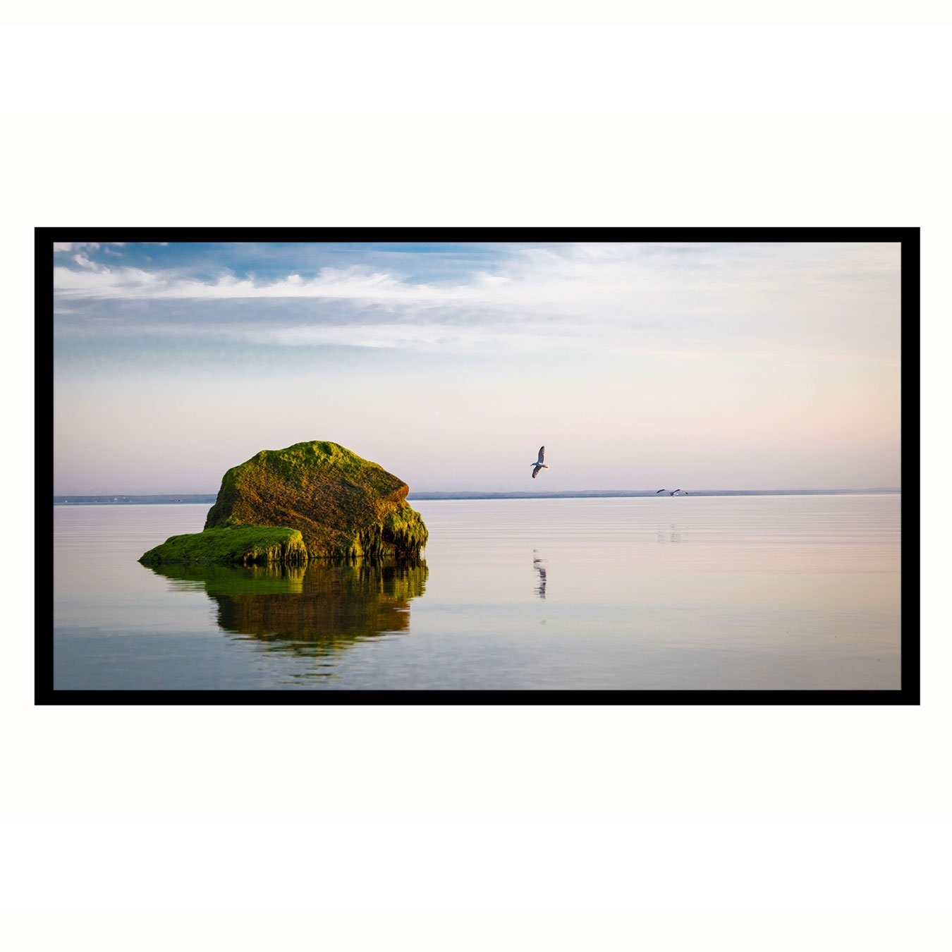 Quadro Paisagem com Rocha Verde e Reflexo no Lago ao Entardecer e Pássaros