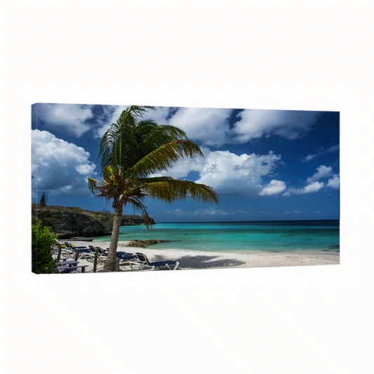 Este quadro de paisagem traz uma praia tropical de areia clara, com um coqueiro em destaque e um mar turquesa que vai ganhando tons mais profundos em direção ao horizonte. O céu azul com nuvens brancas completa a cena com sensação de leveza e amplitude, enquanto as rochas na beira d’água adicionam textura e contraste natural.