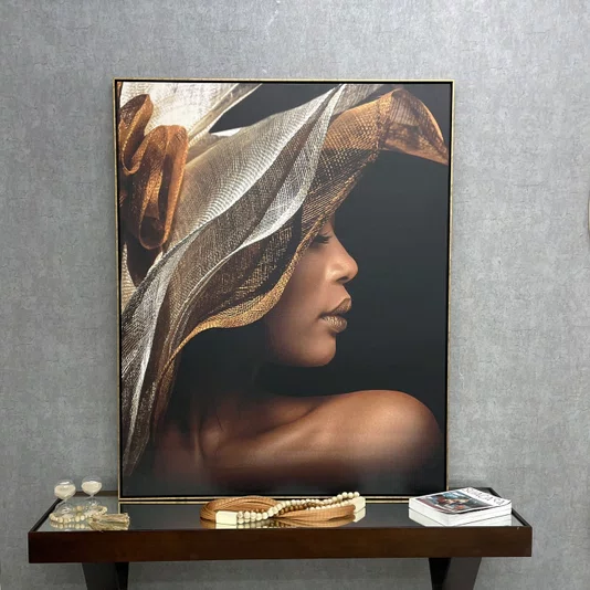 Tela Canvas com Moldura Dourada Retrato de Mulher Negra Elegante 120x150 cm