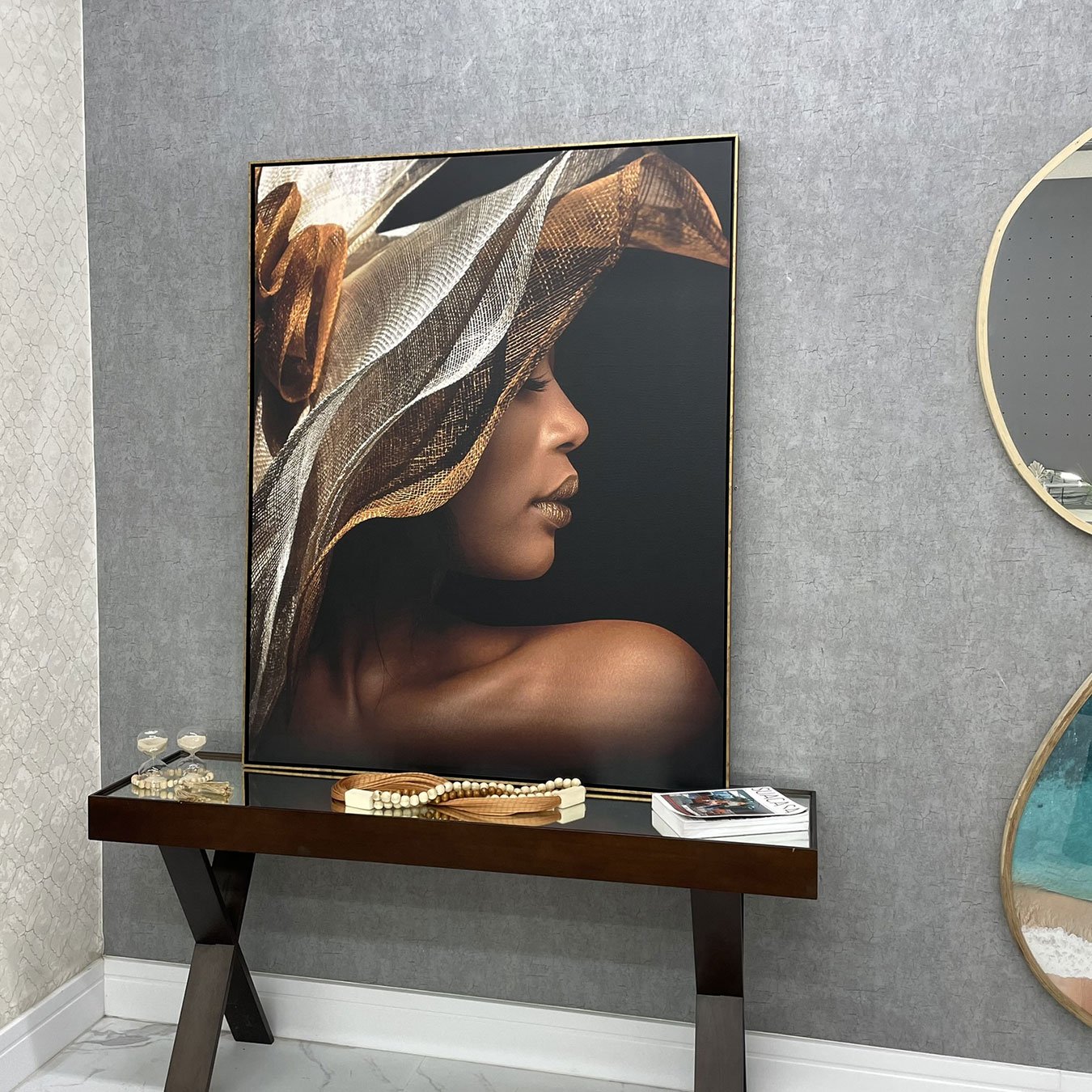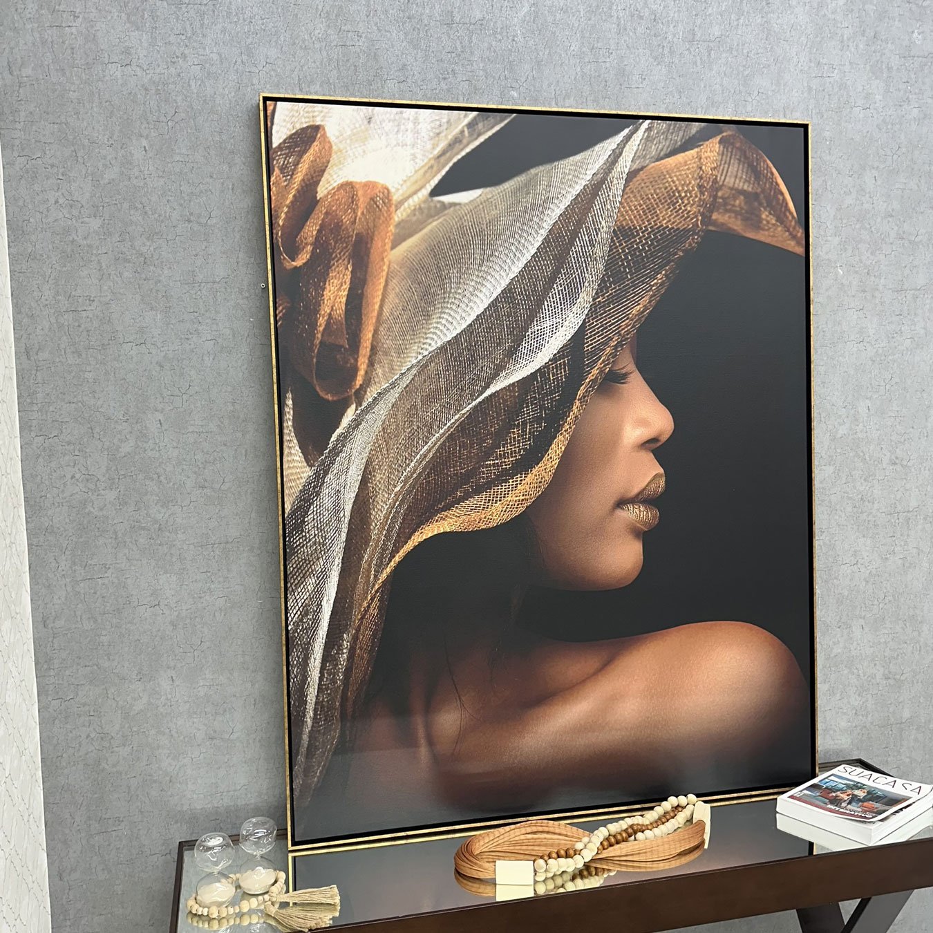A expressão de tranquilidade, com os olhos fechados e o leve sorriso, transmite uma sensação de paz e autoconfiança. Esse contraste entre a leveza do tecido e a força da presença feminina torna este quadro decorativo uma escolha poderosa para ambientes que buscam transmitir cultura e refinamento. A moldura dourada finaliza a peça com um toque de brilho que harmoniza perfeitamente com os detalhes metálicos da composição.