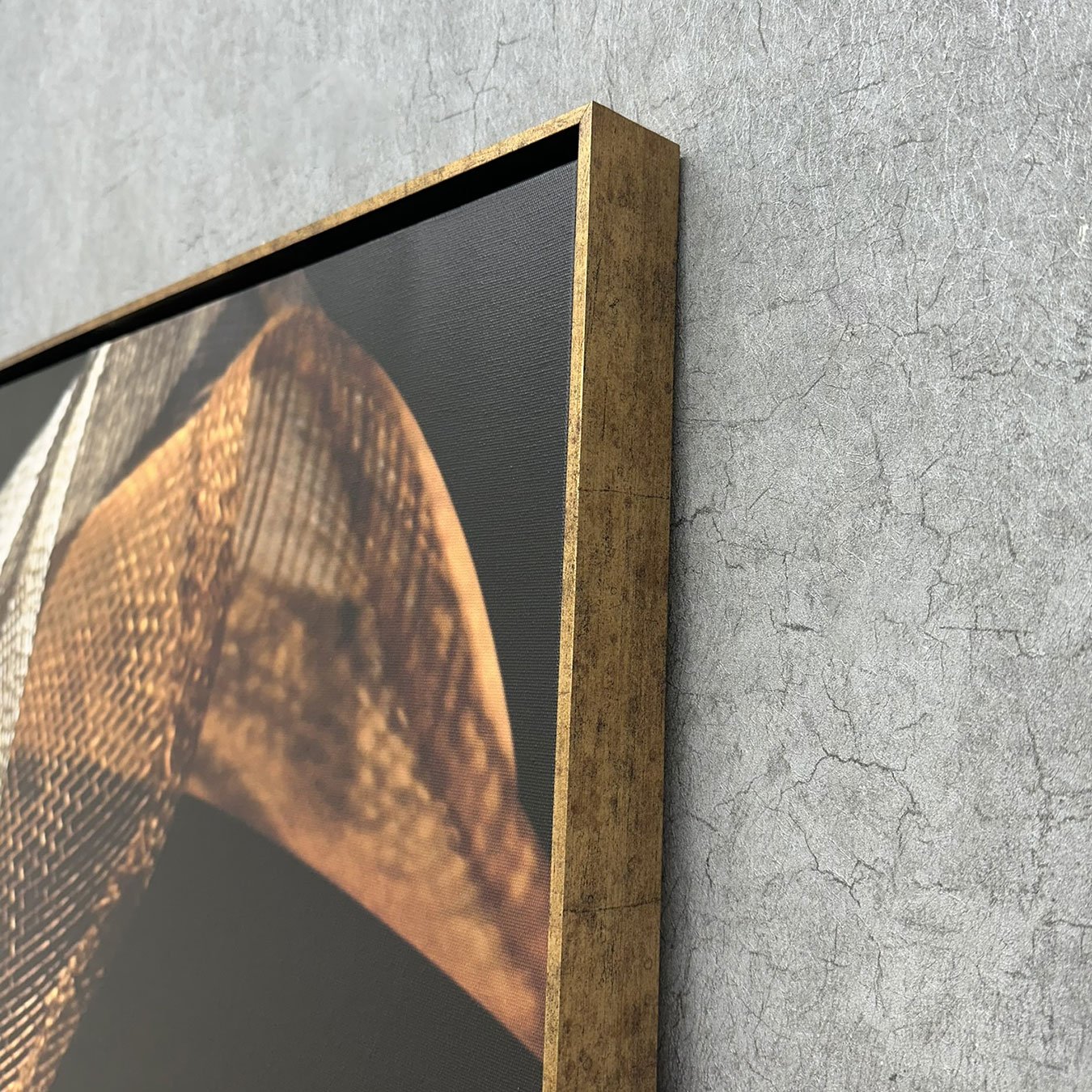 Molduras do tipo Flutuante: A moldura em Madeira Maciça chamada de escadinha flutuante, com dimensão de 0,5x4,4cm, garante uma imagem sutil em que parece flutuar dentro da moldura. A impressão é feita em Tecido Canvas esticado em chassi de madeira maciça e que não necessita do uso de vidro de proteção (não acompanha vidro neste formato).